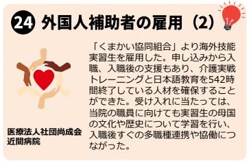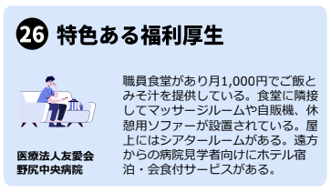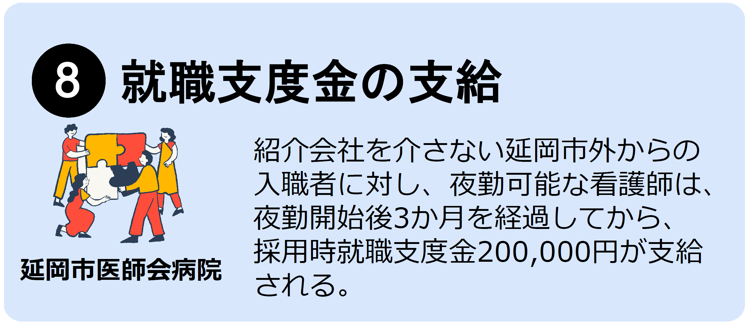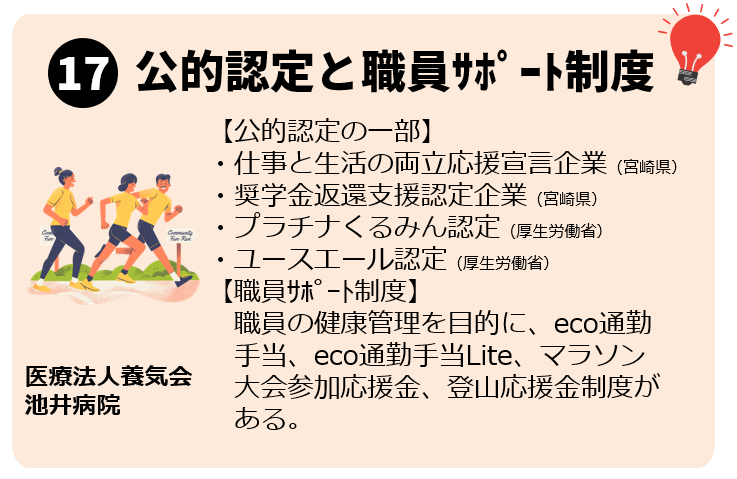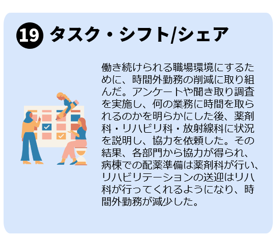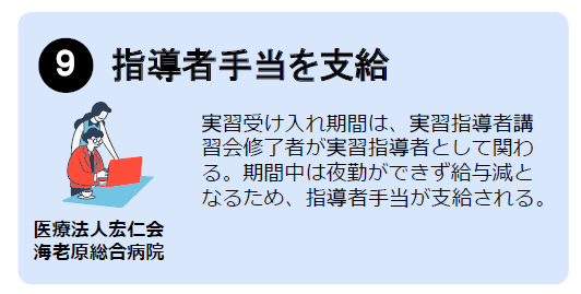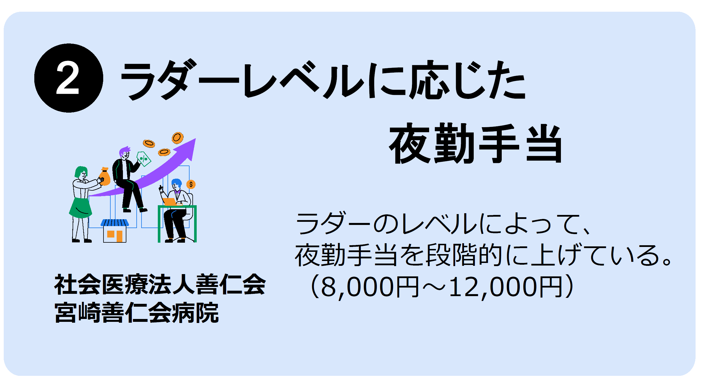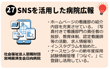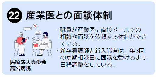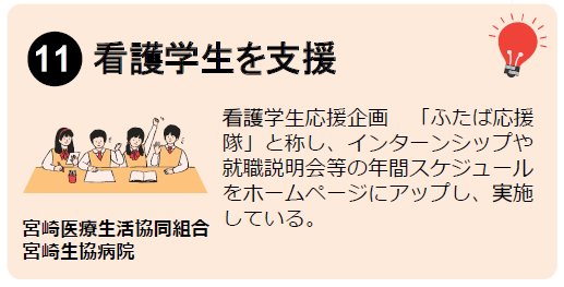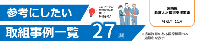 宮崎県では、医師、看護師等の医療従事者の離職防止、定着促進を図るため、「宮崎県 医療勤務環境改善支援センター」を設置し、社会保険労務士と医業経営コンサルタントが県内の医療機関からの医療勤務環境の相談内容に応じて専門的な助言・支援を行います。 [参考リンク]宮崎医療勤務環境改改支援センター |