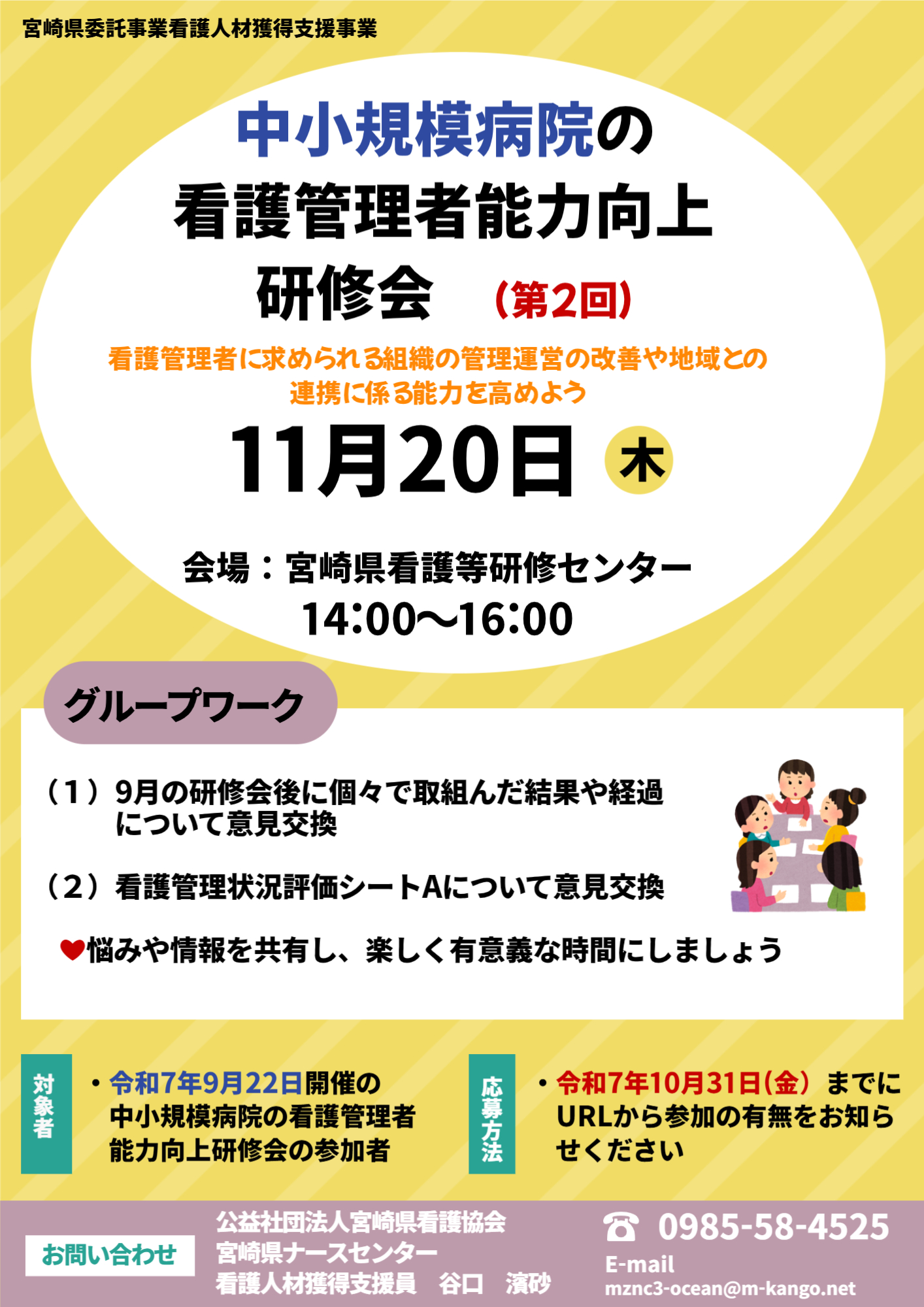 勤務環境等に関する相談窓口宮崎県ナースセンターは「みやざきの看護を支える」勤務環境等に関する相談窓口を設置しています リーフレットはこちら >> |