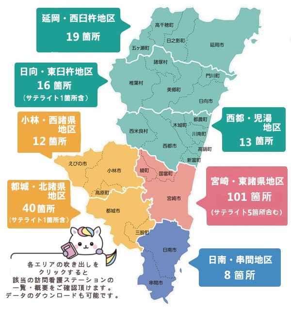 宮崎県内の訪問看護ステーションは、令和7年8月現在、214箇所(サテライト7箇所含)の事業所があり、県北エリア(3地区)・県央エリア(1地区)・県西エリア(2地区)・県南エリア(1地区)の4つのエリア7地区ごとに、掲載に同意された事業所のみを紹介します。