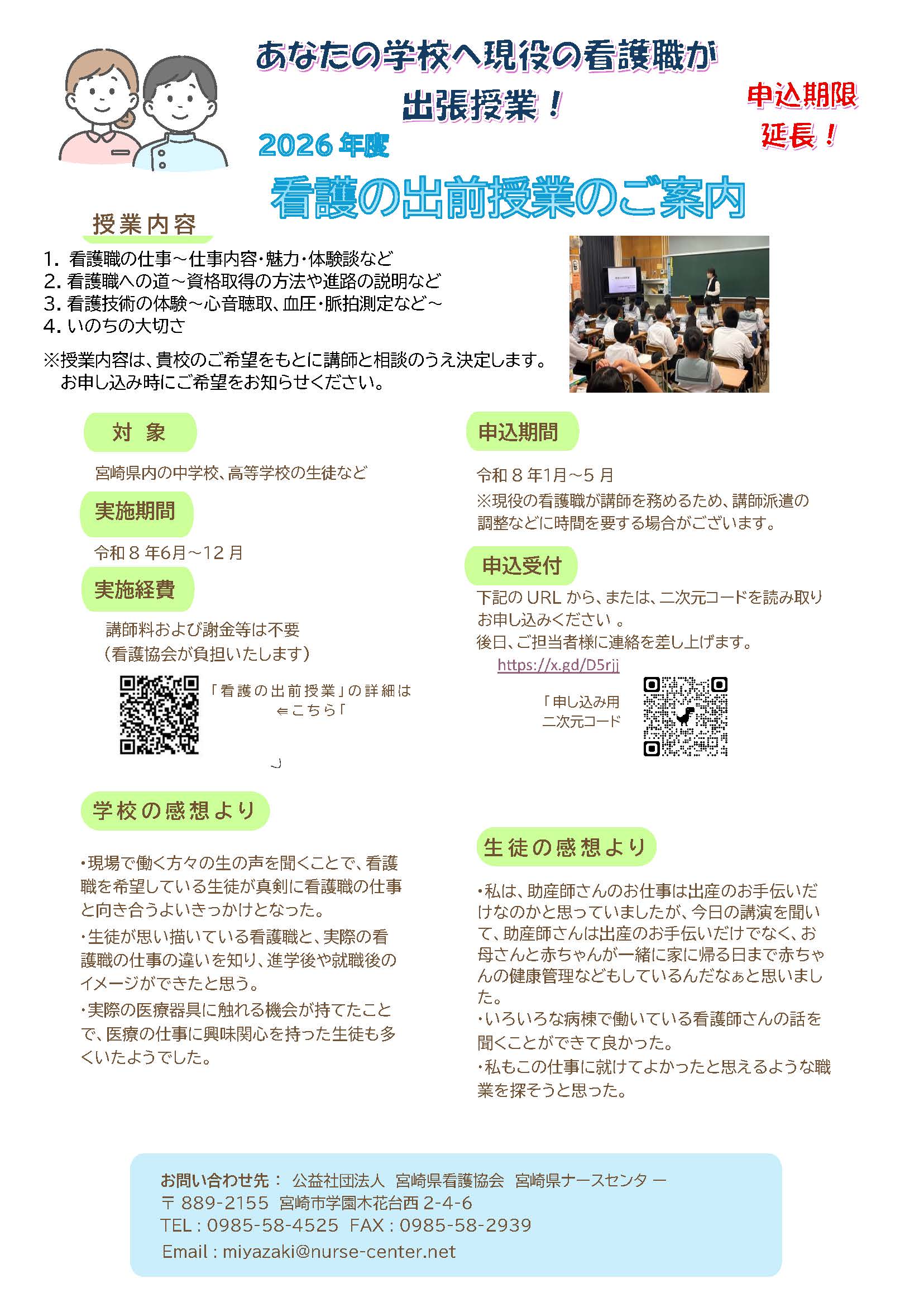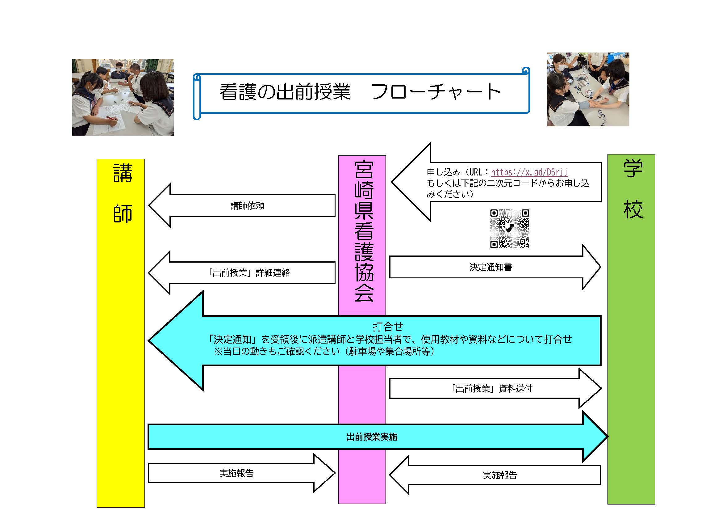 | 【実施報告】 | 実施後は、所定の様式にて実施報告を作成し、1週間以内にメールまたは郵送にてお送りください。 送付先:宮崎県ナースセンター 様式A:学校用実施報告書(EXCEL) 様式B:講師用実施報告書(EXCEL) |