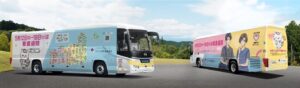 看護の出前授業(宮崎市立加納中学校)、ラッピングバスが宮崎市内を巡行しPRします。