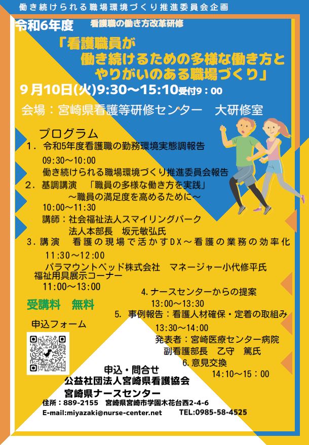 働き続けられる職場環境づくり推進委員会企画研修、 令和6年度看護職の働き方改革研修として 「看護職員が働き続けるための多様な働き方とやりがいのある職場づくり」を開催いたします。 事務職員・看護職員の参加をお待ちしています。 【実施要綱】ダウンロードは、こちら。 |