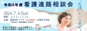 令和6年7月6日(土)、宮崎市民プラザで「令和6年度看護進路相談会」を行います。看護職を目指す中・高生はもちろん、キャリアチェンジや学び直しを考える社会人の方、看護に興味・関心がある方は、ぜひご参加ください。